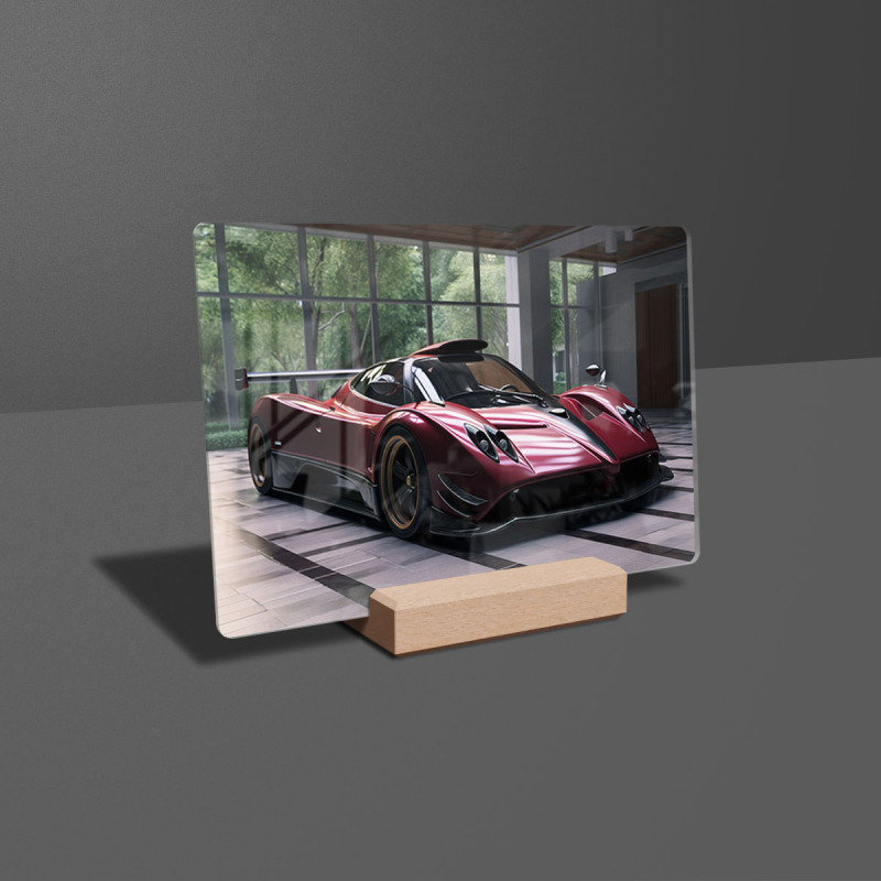 Na produktovém fotu vyobrazena nejoblíbenější varianta akrylového skla 14x21/21x14cm a dřevěný stojánek 10x10cm.