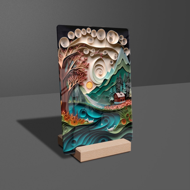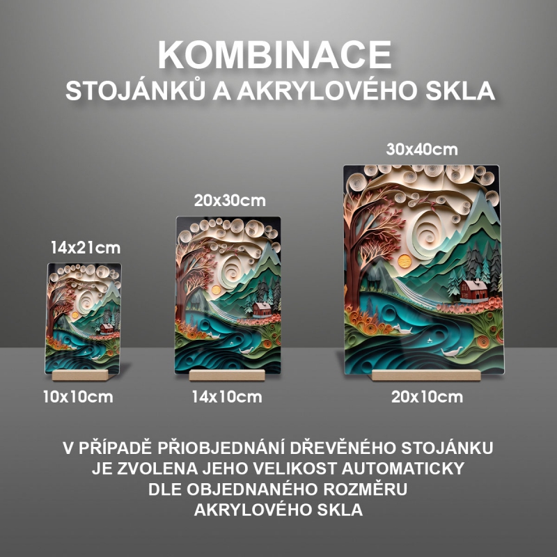 Na produktovém fotu vyobrazena nejoblíbenější varianta akrylového skla 14x21/21x14cm a dřevěný stojánek 10x10cm.