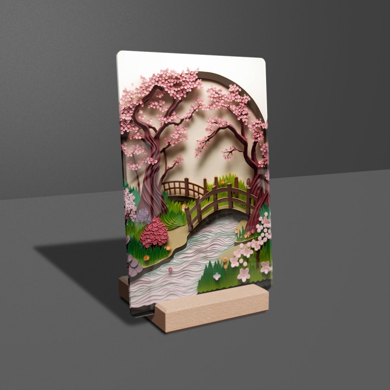 Na produktovém fotu vyobrazena nejoblíbenější varianta akrylového skla 14x21/21x14cm a dřevěný stojánek 10x10cm.
