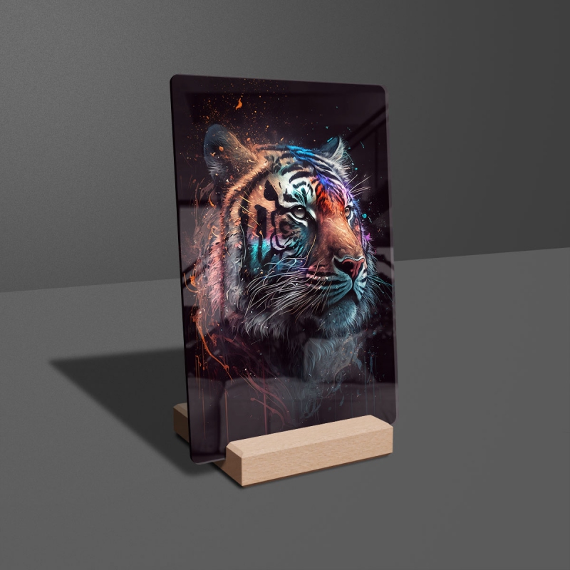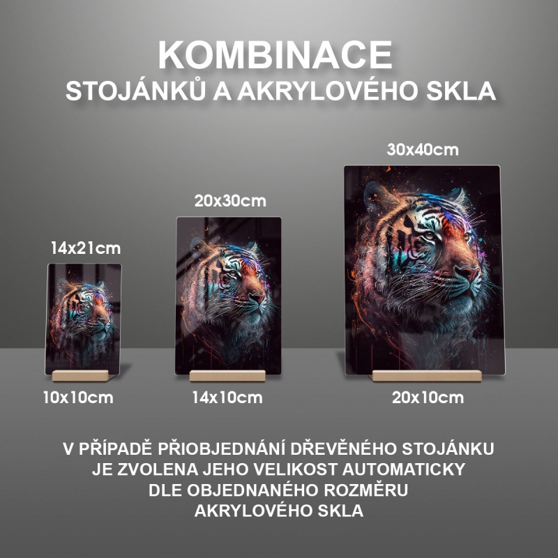 Na produktovém fotu vyobrazena nejoblíbenější varianta akrylového skla 14x21/21x14cm a dřevěný stojánek 10x10cm.