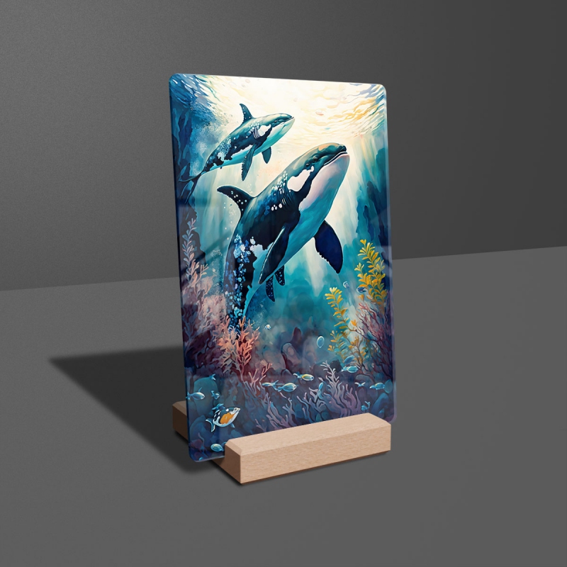 Na produktovém fotu vyobrazena nejoblíbenější varianta akrylového skla 14x21/21x14cm a dřevěný stojánek 10x10cm.