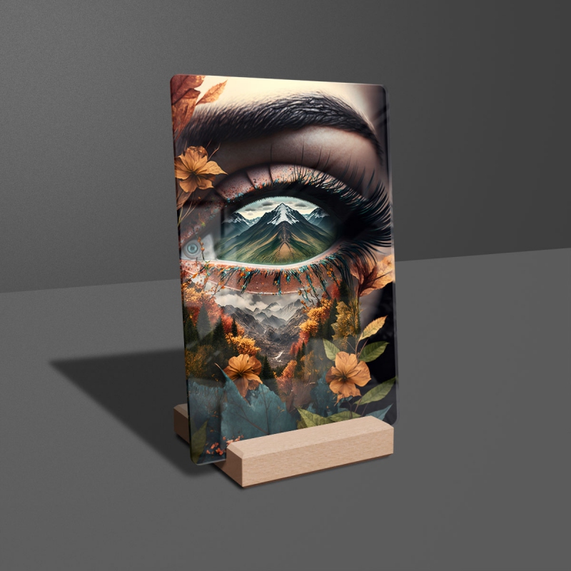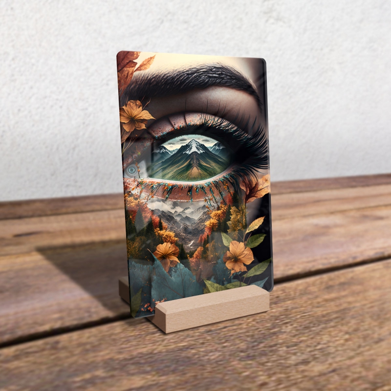Na produktovém fotu vyobrazena nejoblíbenější varianta akrylového skla 14x21/21x14cm a dřevěný stojánek 10x10cm.