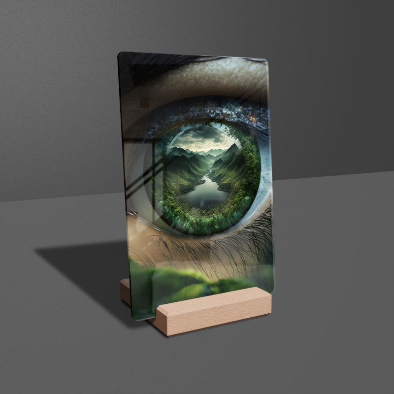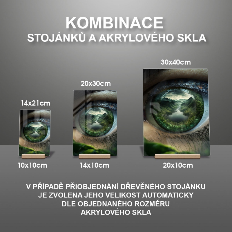 Na produktovém fotu vyobrazena nejoblíbenější varianta akrylového skla 14x21/21x14cm a dřevěný stojánek 10x10cm.