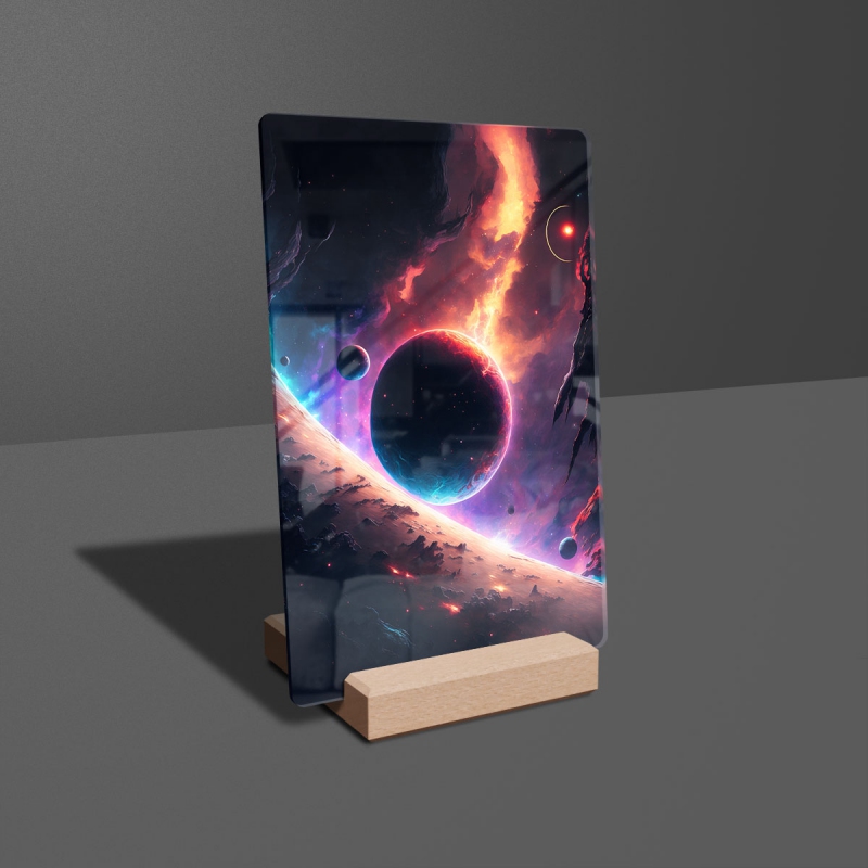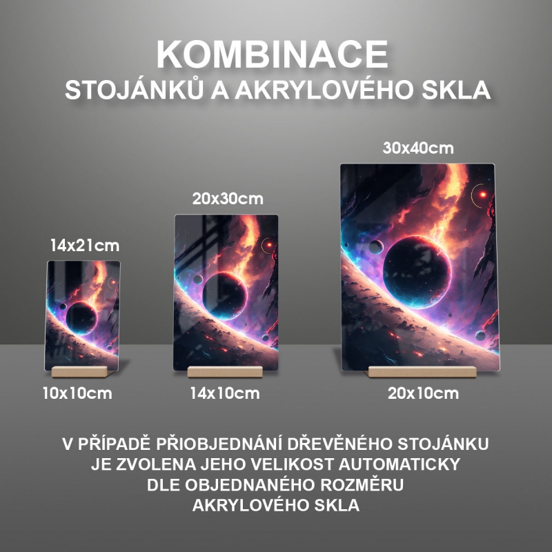 Na produktovém fotu vyobrazena nejoblíbenější varianta akrylového skla 14x21/21x14cm a dřevěný stojánek 10x10cm.