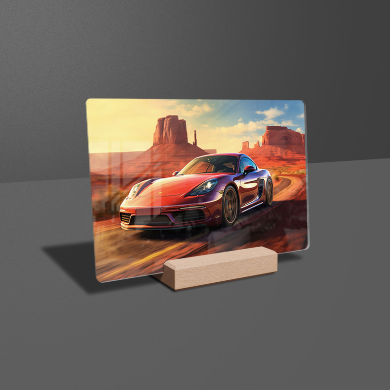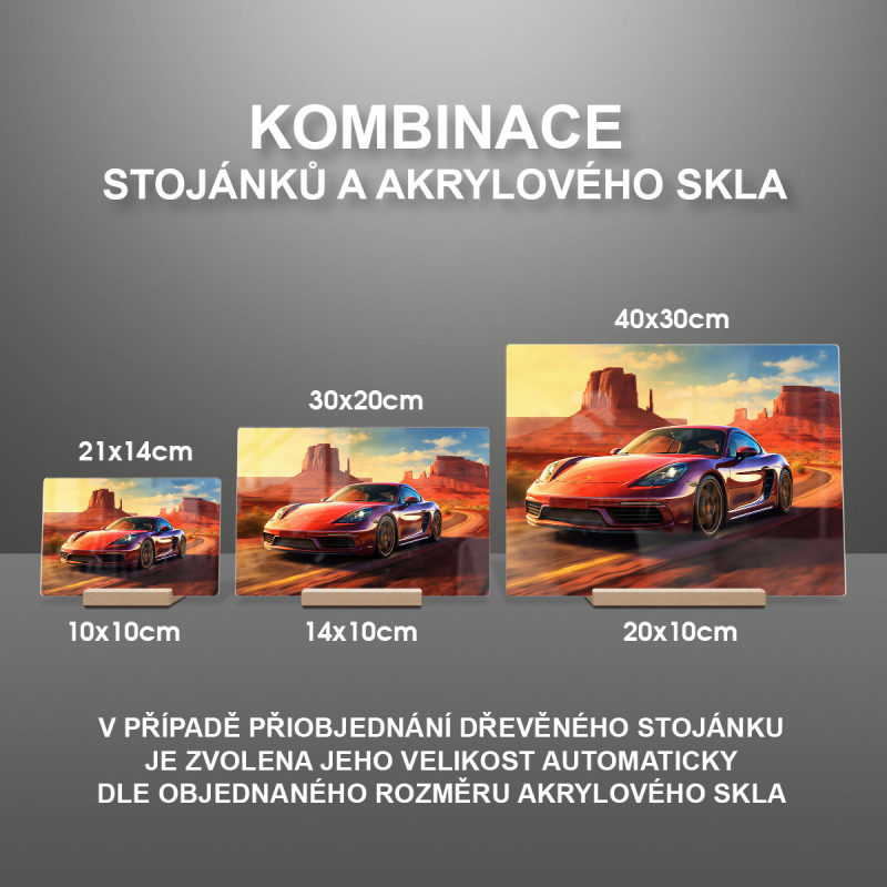 Na produktovém fotu vyobrazena nejoblíbenější varianta akrylového skla 14x21/21x14cm a dřevěný stojánek 10x10cm.