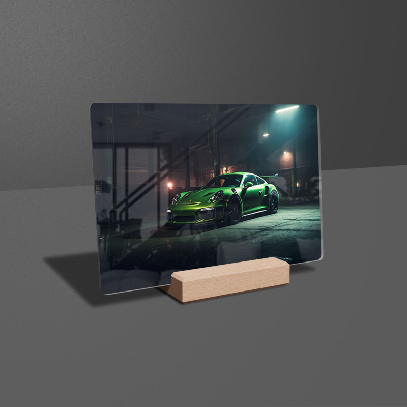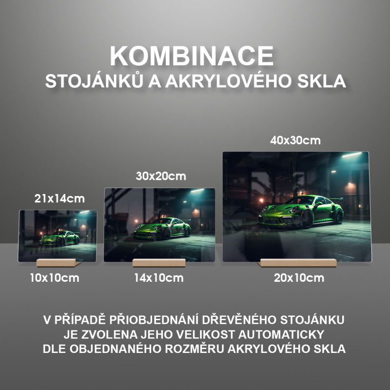 Na produktovém fotu vyobrazena nejoblíbenější varianta akrylového skla 14x21/21x14cm a dřevěný stojánek 10x10cm.