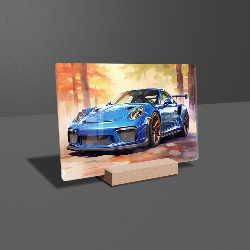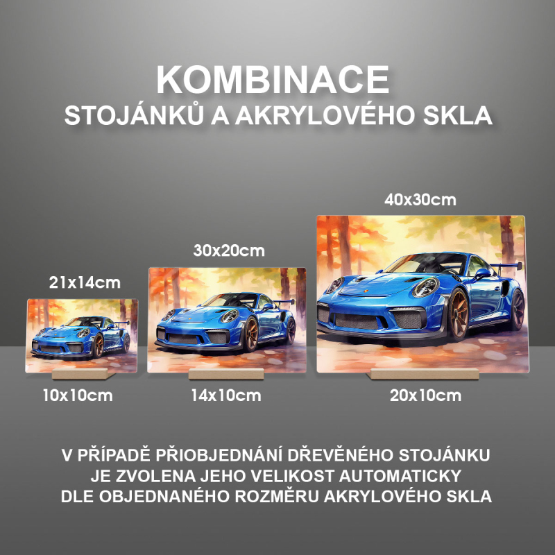 Na produktovém fotu vyobrazena nejoblíbenější varianta akrylového skla 14x21/21x14cm a dřevěný stojánek 10x10cm.
