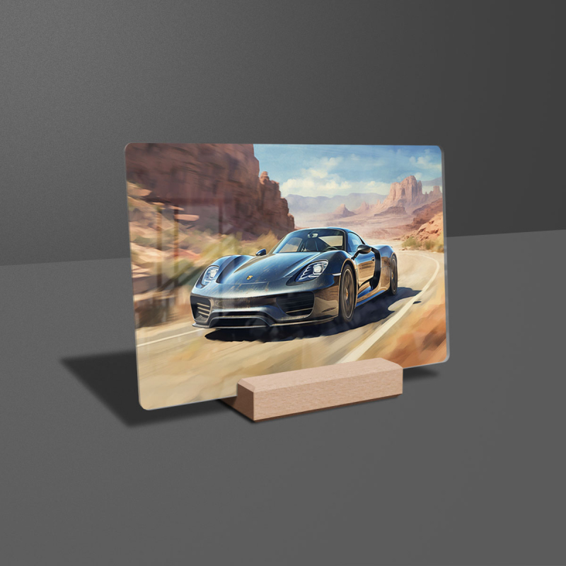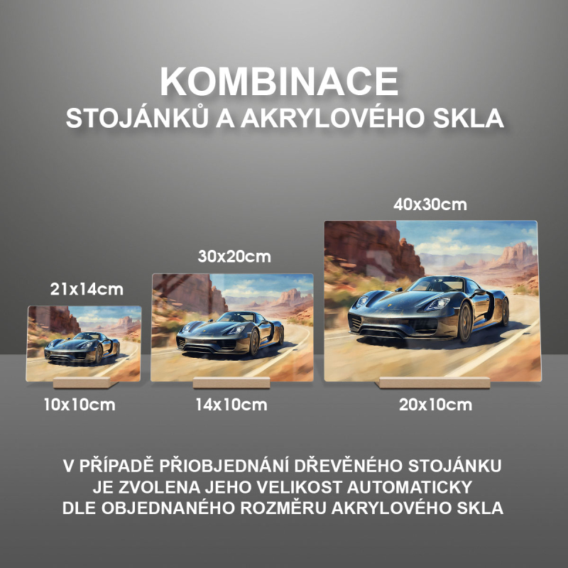 Na produktovém fotu vyobrazena nejoblíbenější varianta akrylového skla 14x21/21x14cm a dřevěný stojánek 10x10cm.