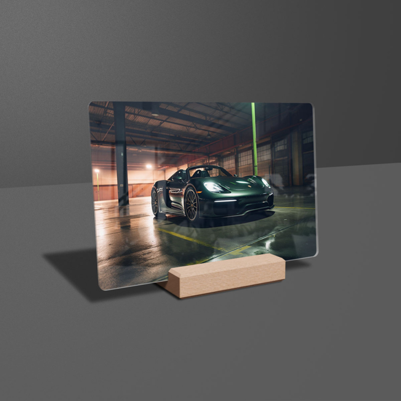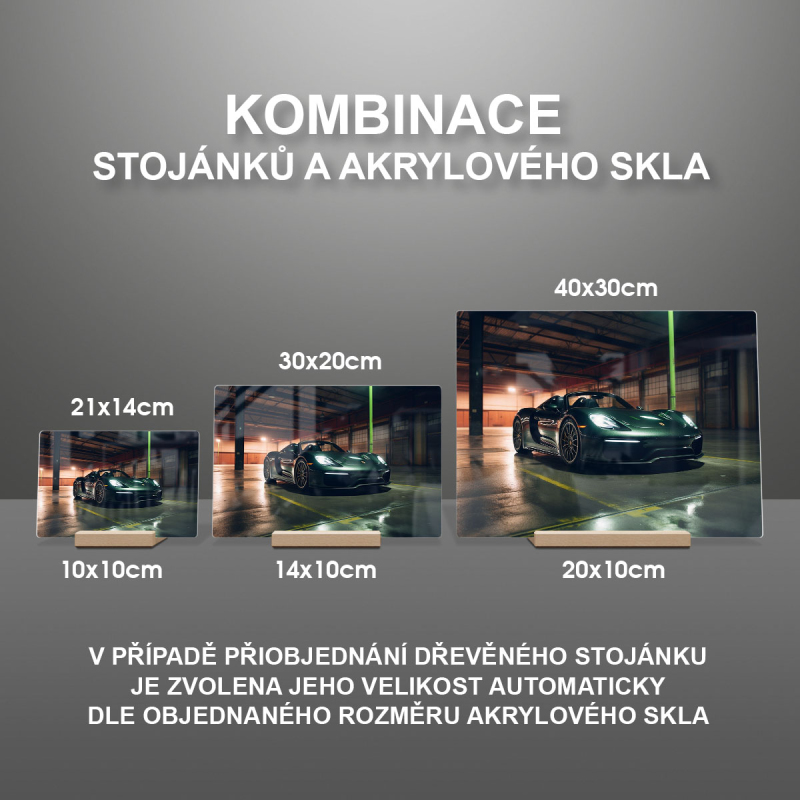 Na produktovém fotu vyobrazena nejoblíbenější varianta akrylového skla 14x21/21x14cm a dřevěný stojánek 10x10cm.