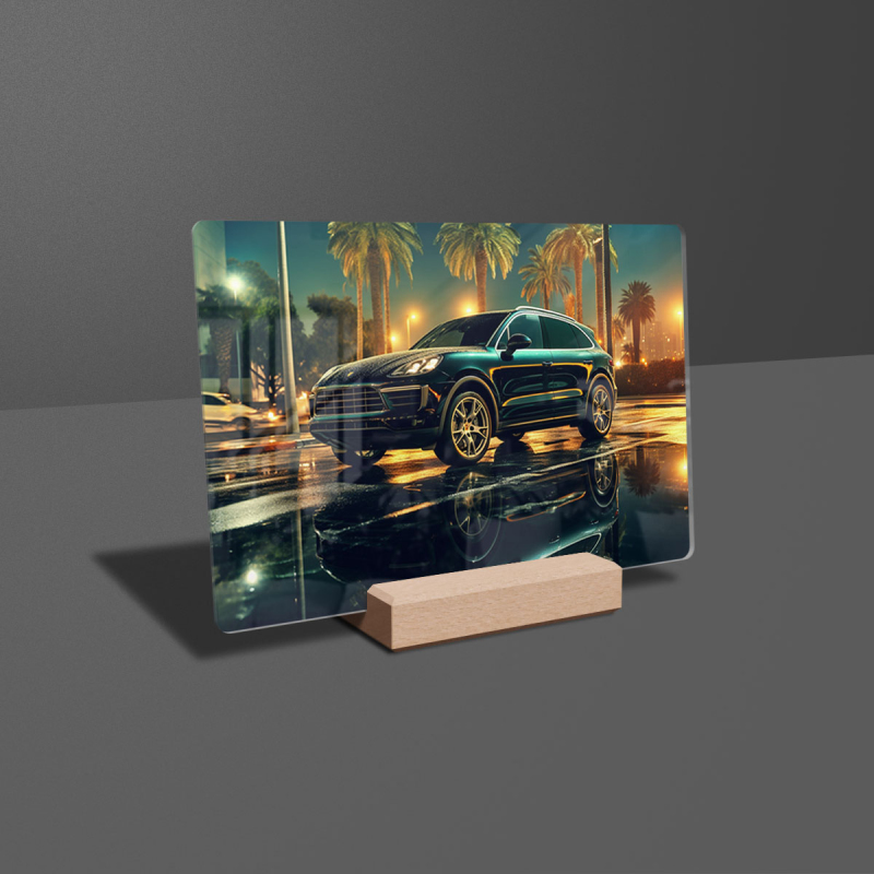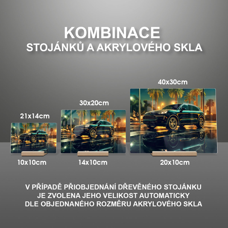 Na produktovém fotu vyobrazena nejoblíbenější varianta akrylového skla 14x21/21x14cm a dřevěný stojánek 10x10cm.