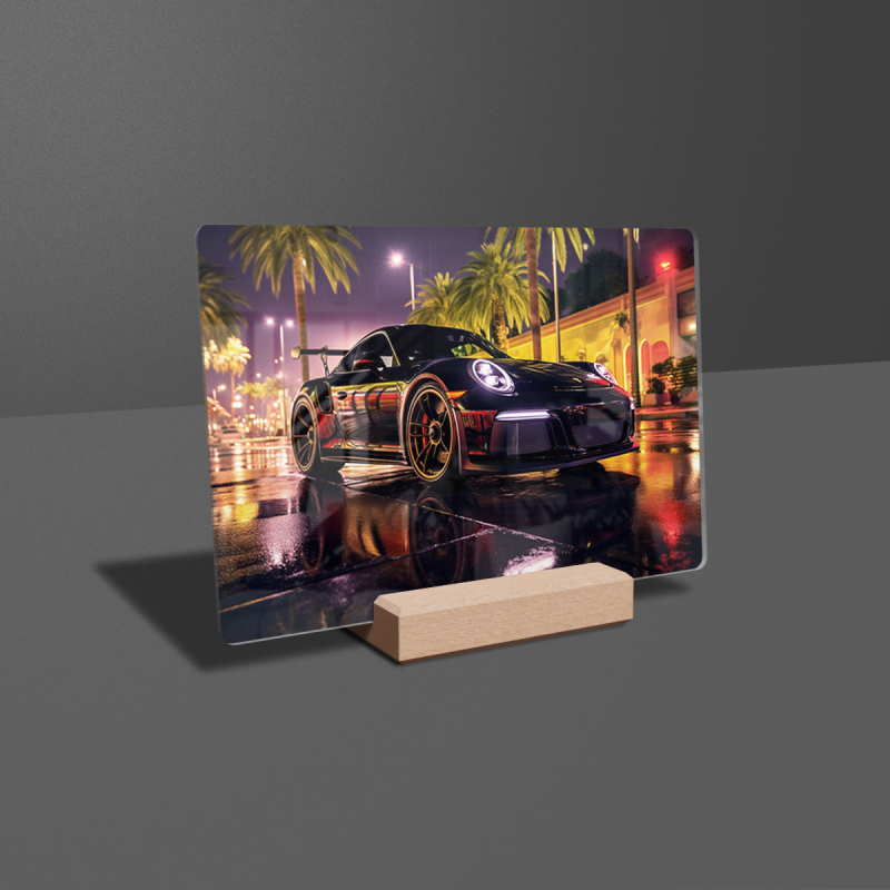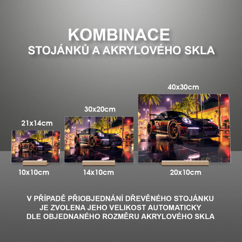 Na produktovém fotu vyobrazena nejoblíbenější varianta akrylového skla 14x21/21x14cm a dřevěný stojánek 10x10cm.