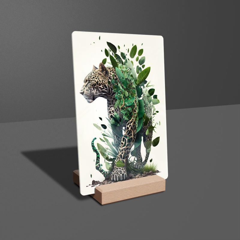 Na produktovém fotu vyobrazena nejoblíbenější varianta akrylového skla 14x21/21x14cm a dřevěný stojánek 10x10cm.