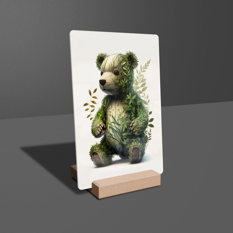Na produktovém fotu vyobrazena nejoblíbenější varianta akrylového skla 14x21/21x14cm a dřevěný stojánek 10x10cm.