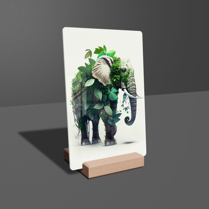 Na produktovém fotu vyobrazena nejoblíbenější varianta akrylového skla 14x21/21x14cm a dřevěný stojánek 10x10cm.