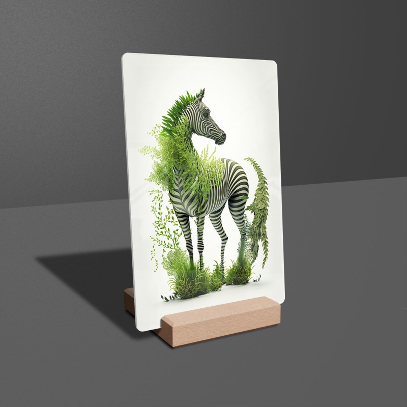 Na produktovém fotu vyobrazena nejoblíbenější varianta akrylového skla 14x21/21x14cm a dřevěný stojánek 10x10cm.