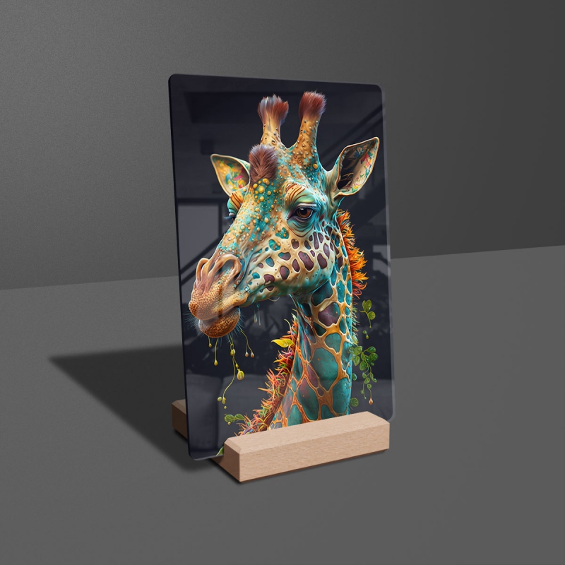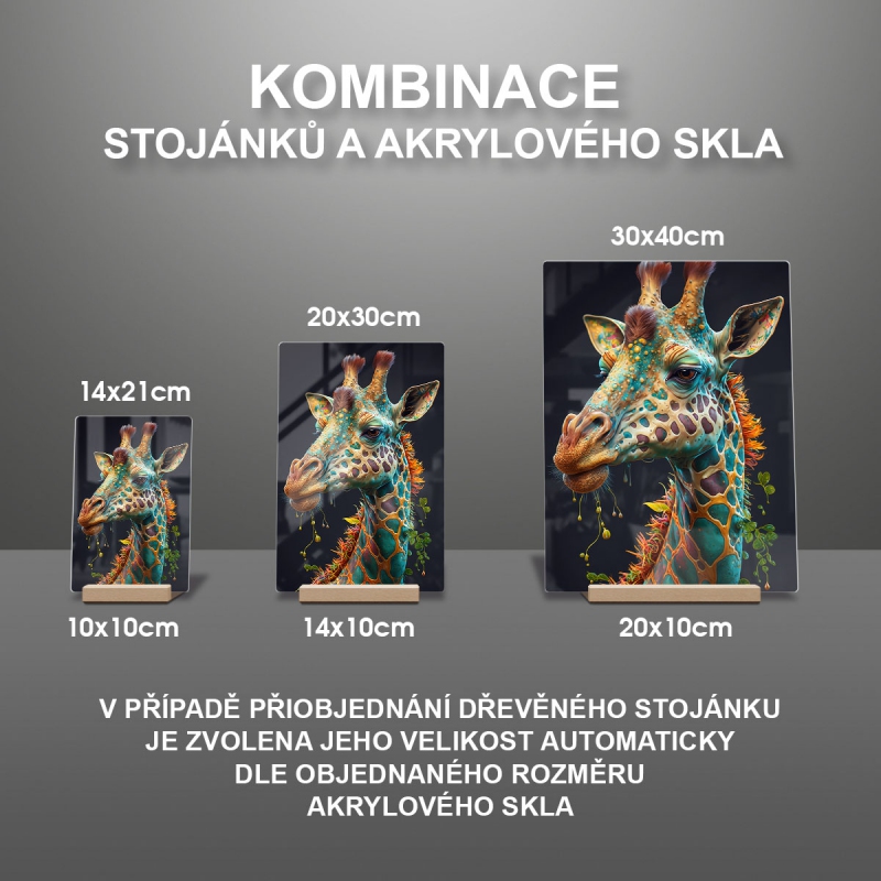 Na produktovém fotu vyobrazena nejoblíbenější varianta akrylového skla 14x21/21x14cm a dřevěný stojánek 10x10cm.