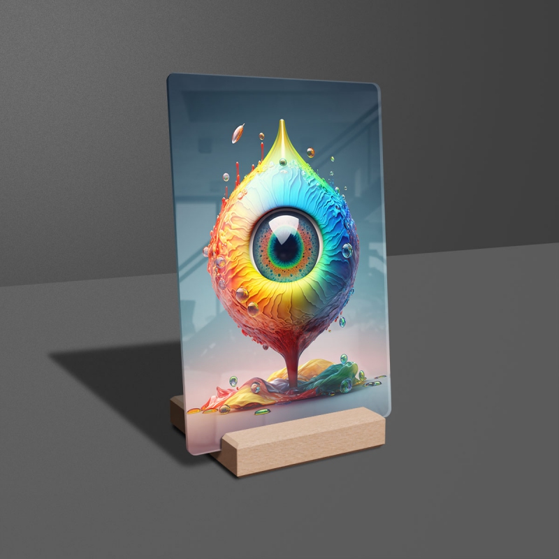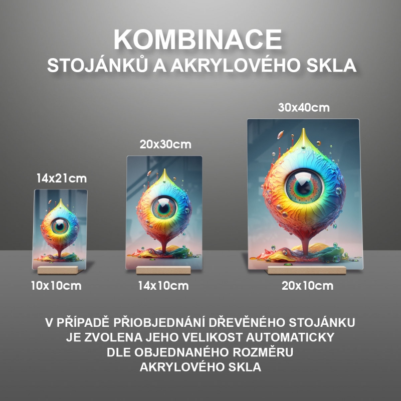 Na produktovém fotu vyobrazena nejoblíbenější varianta akrylového skla 14x21/21x14cm a dřevěný stojánek 10x10cm.