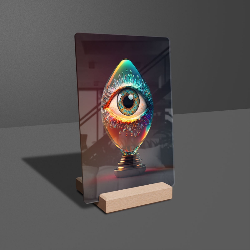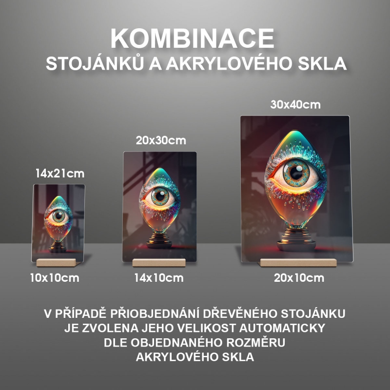 Na produktovém fotu vyobrazena nejoblíbenější varianta akrylového skla 14x21/21x14cm a dřevěný stojánek 10x10cm.