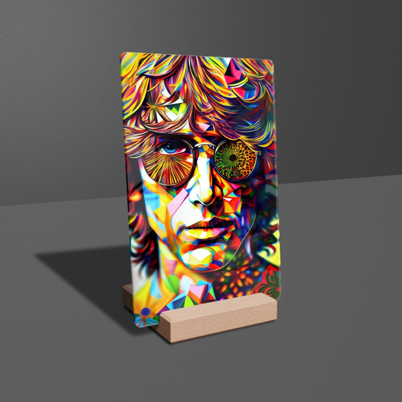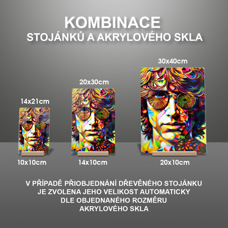Na produktovém fotu vyobrazena nejoblíbenější varianta akrylového skla 14x21/21x14cm a dřevěný stojánek 10x10cm.