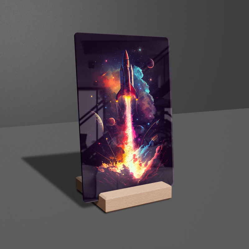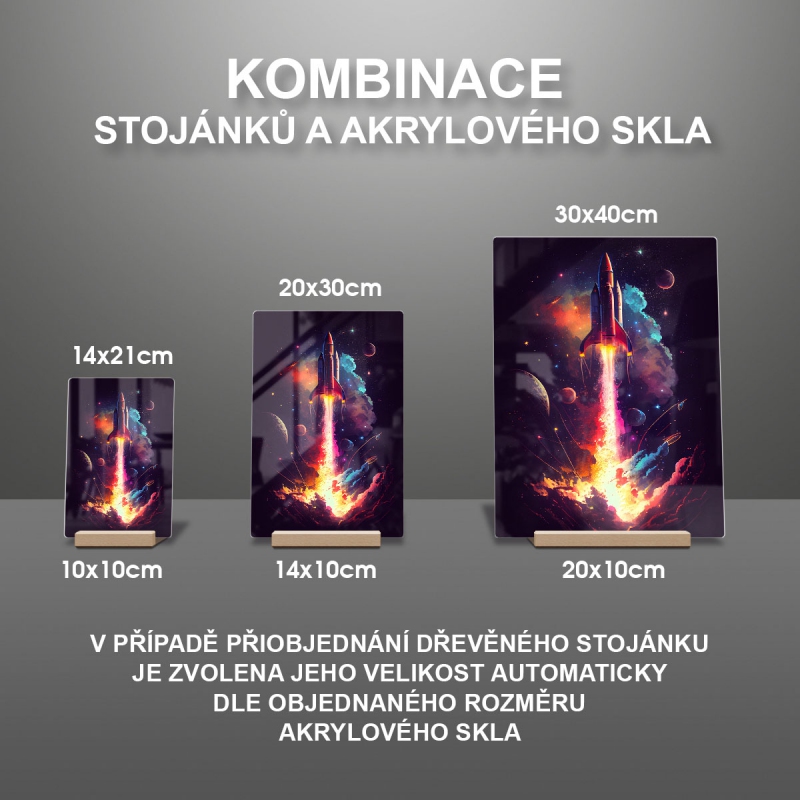 Na produktovém fotu vyobrazena nejoblíbenější varianta akrylového skla 14x21/21x14cm a dřevěný stojánek 10x10cm.