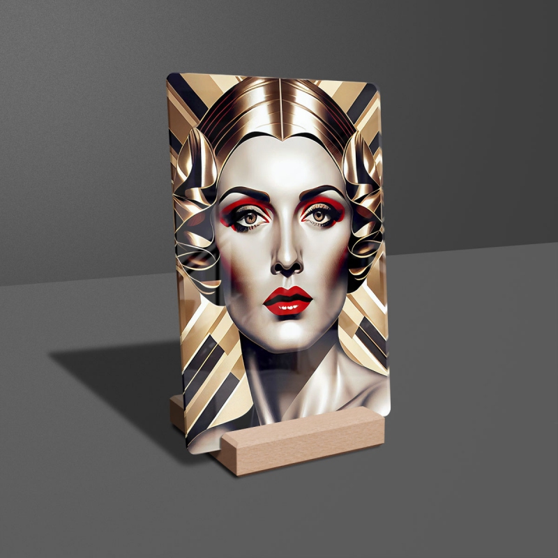Na produktovém fotu vyobrazena nejoblíbenější varianta akrylového skla 14x21/21x14cm a dřevěný stojánek 10x10cm.