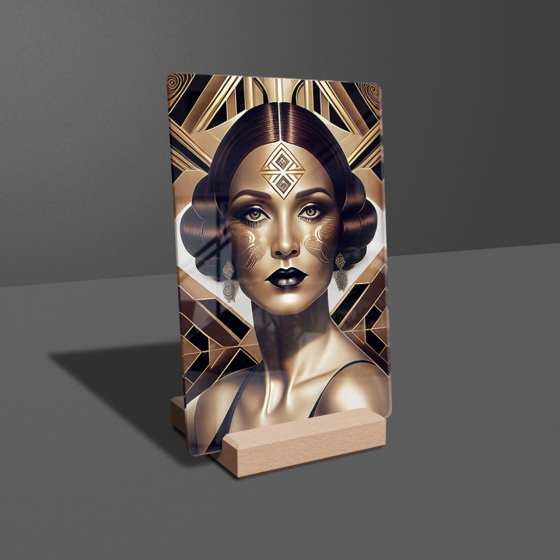 Na produktovém fotu vyobrazena nejoblíbenější varianta akrylového skla 14x21/21x14cm a dřevěný stojánek 10x10cm.