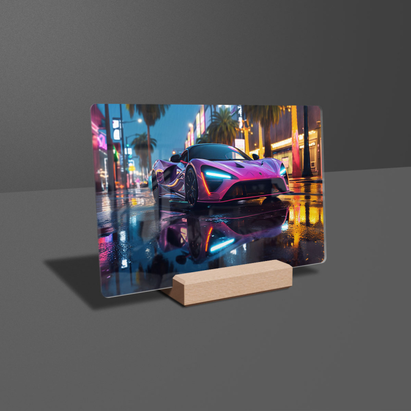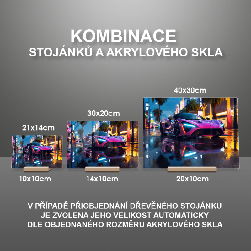 Na produktovém fotu vyobrazena nejoblíbenější varianta akrylového skla 14x21/21x14cm a dřevěný stojánek 10x10cm.
