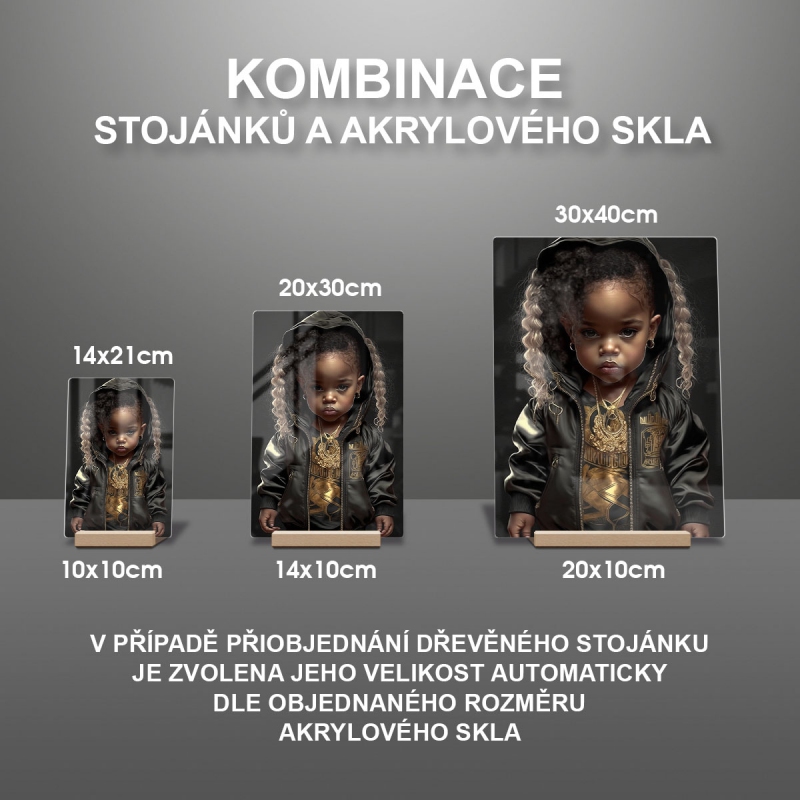 Na produktovém fotu vyobrazena nejoblíbenější varianta akrylového skla 14x21/21x14cm a dřevěný stojánek 10x10cm.