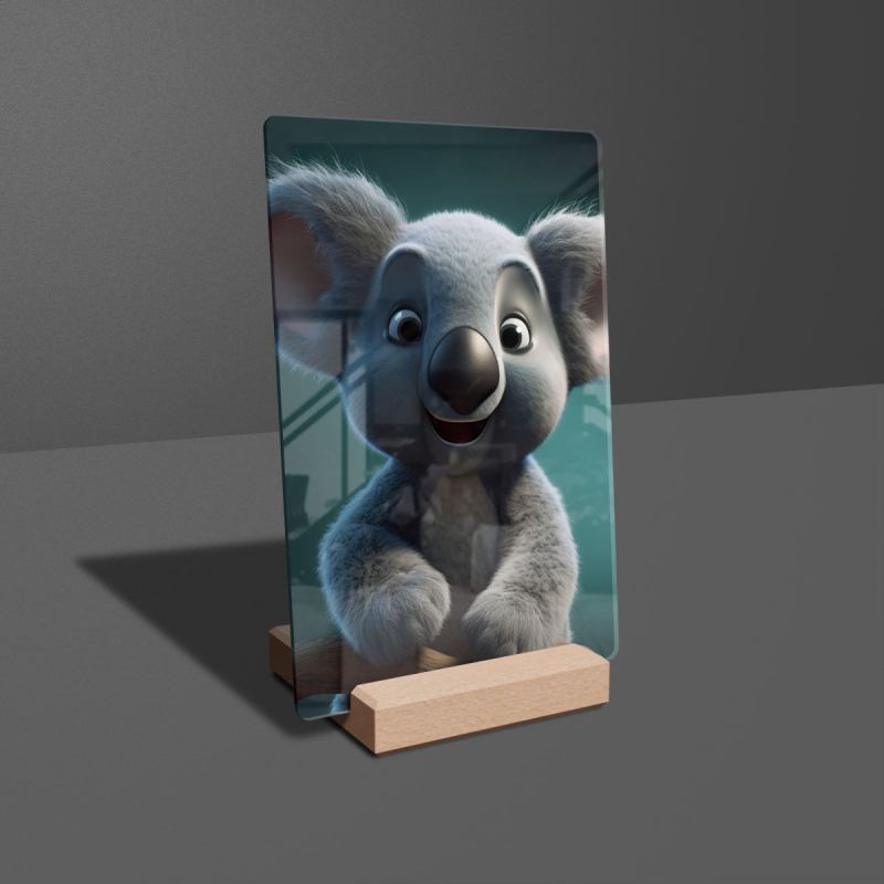 Na produktovém fotu vyobrazena nejoblíbenější varianta akrylového skla 14x21/21x14cm a dřevěný stojánek 10x10cm.