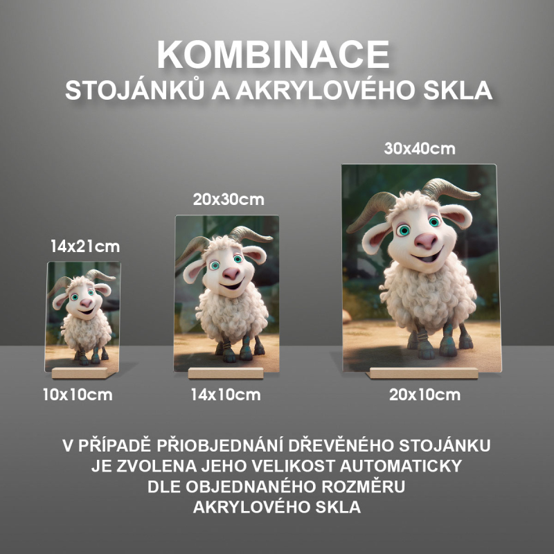 V případě přiobjednání dřevěného stojánku je zvolena jeho velikost automaticky dle objednaného rozměru akrylového skla viz produktové foto.