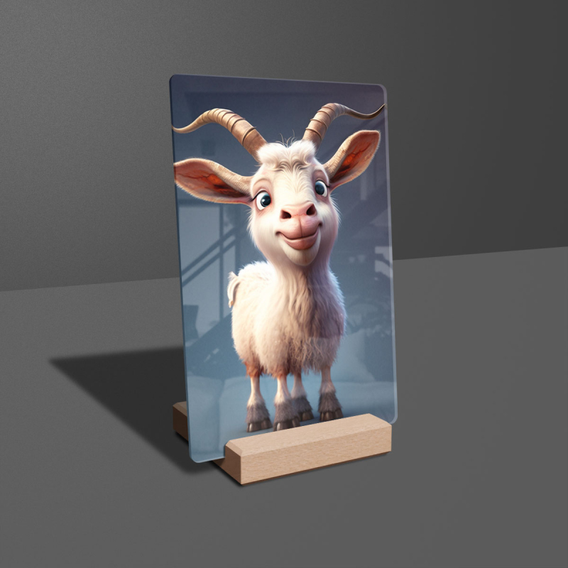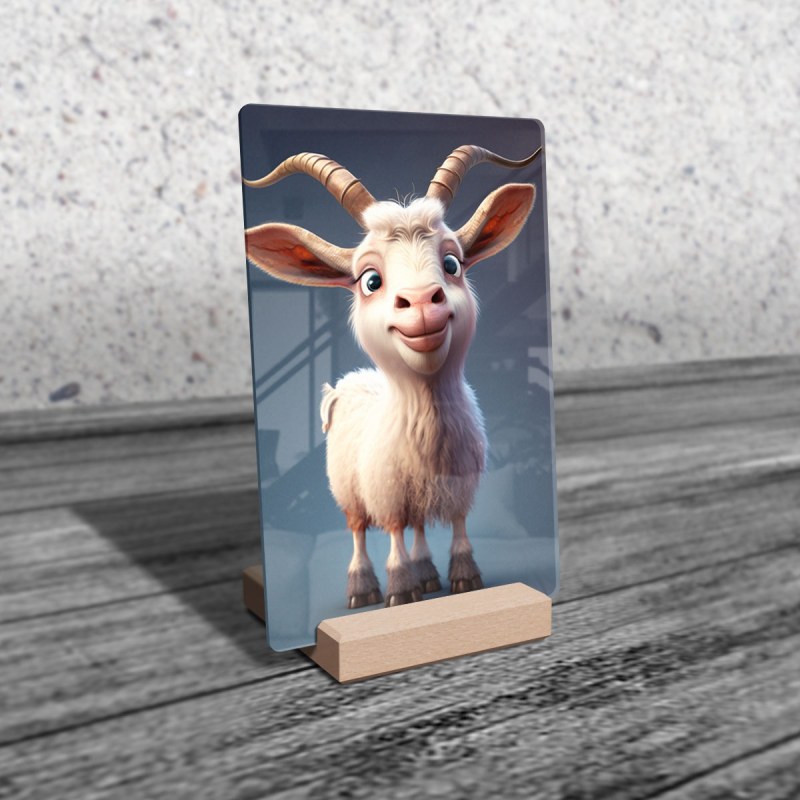 Na produktovém fotu vyobrazena nejoblíbenější varianta akrylového skla 14x21/21x14cm a dřevěný stojánek 10x10cm.