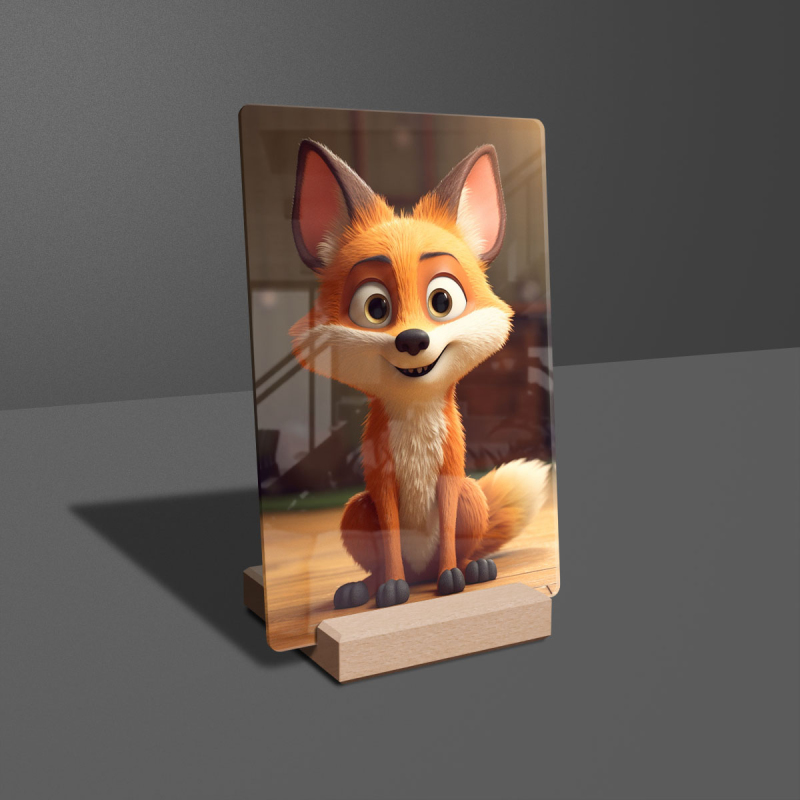 Na produktovém fotu vyobrazena nejoblíbenější varianta akrylového skla 14x21/21x14cm a dřevěný stojánek 10x10cm.