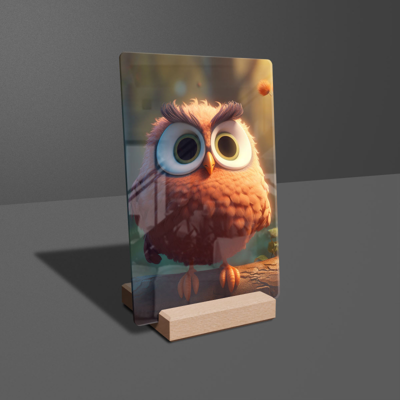 Na produktovém fotu vyobrazena nejoblíbenější varianta akrylového skla 14x21/21x14cm a dřevěný stojánek 10x10cm.