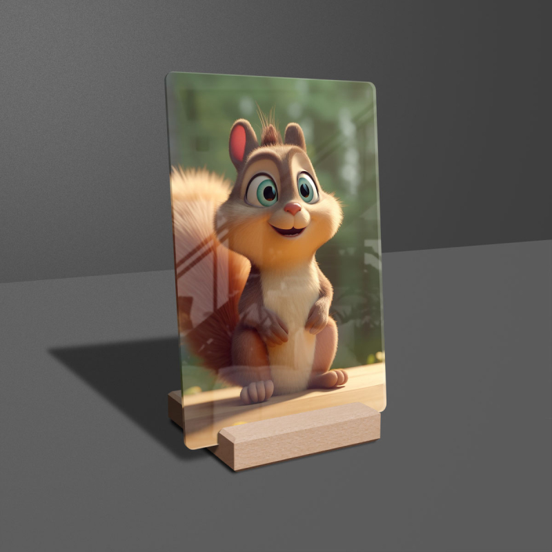 Na produktovém fotu vyobrazena nejoblíbenější varianta akrylového skla 14x21/21x14cm a dřevěný stojánek 10x10cm.