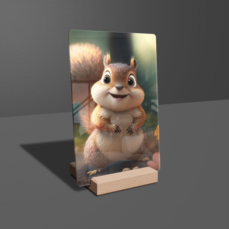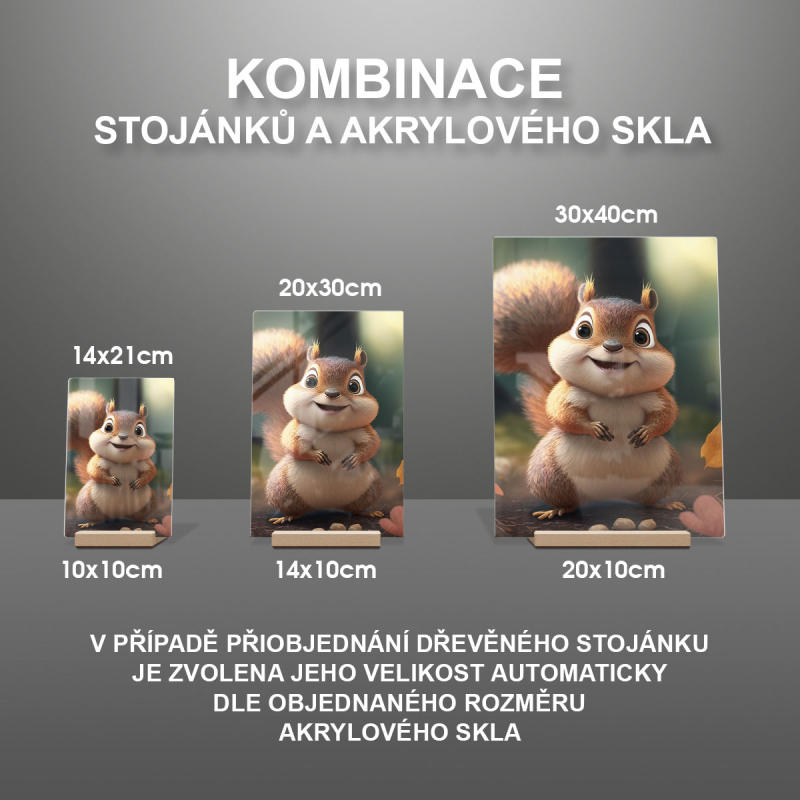 Na produktovém fotu vyobrazena nejoblíbenější varianta akrylového skla 14x21/21x14cm a dřevěný stojánek 10x10cm.