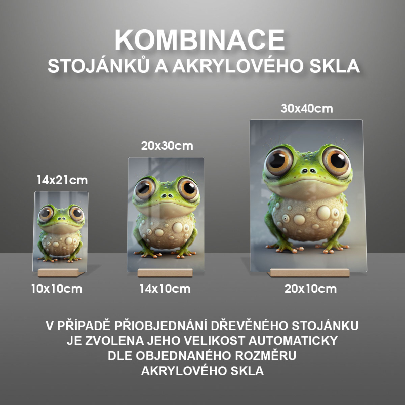 Na produktovém fotu vyobrazena nejoblíbenější varianta akrylového skla 14x21/21x14cm a dřevěný stojánek 10x10cm.