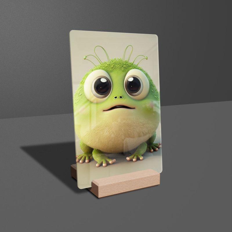 Na produktovém fotu vyobrazena nejoblíbenější varianta akrylového skla 14x21/21x14cm a dřevěný stojánek 10x10cm.
