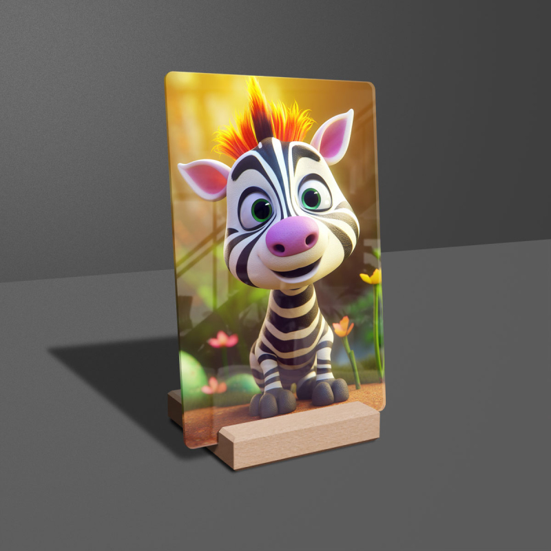 Na produktovém fotu vyobrazena nejoblíbenější varianta akrylového skla 14x21/21x14cm a dřevěný stojánek 10x10cm.