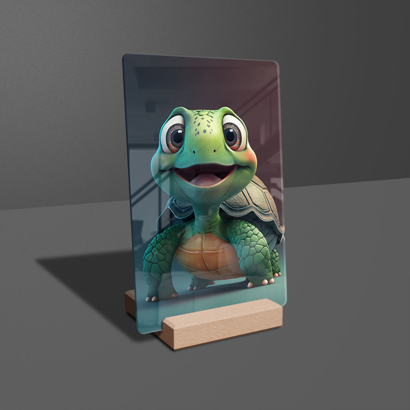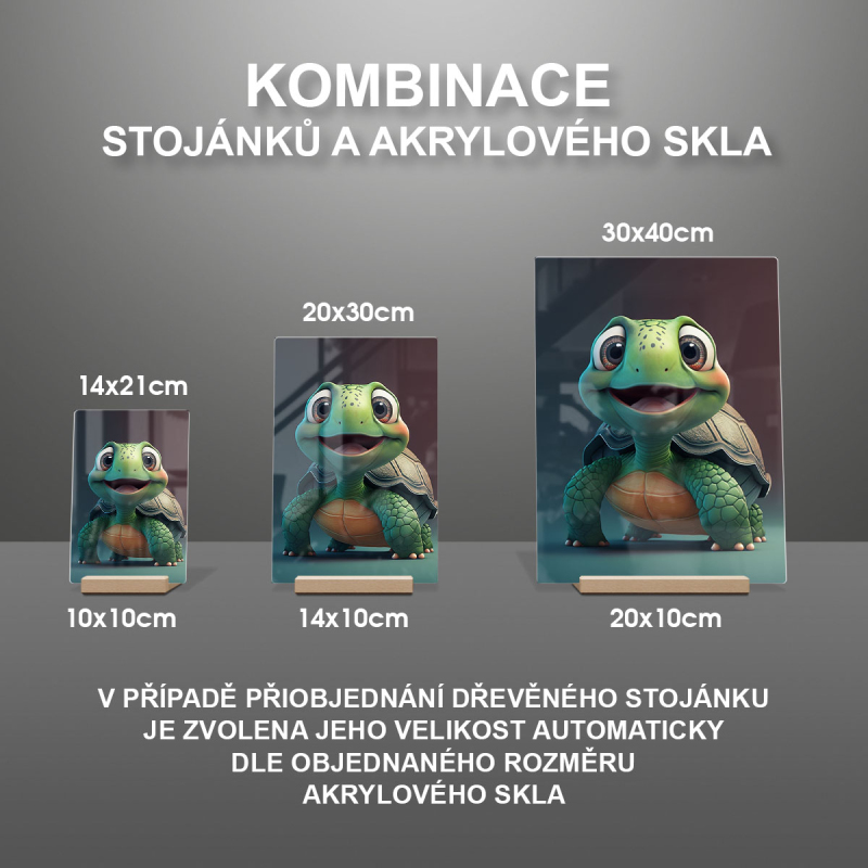 Na produktovém fotu vyobrazena nejoblíbenější varianta akrylového skla 14x21/21x14cm a dřevěný stojánek 10x10cm.