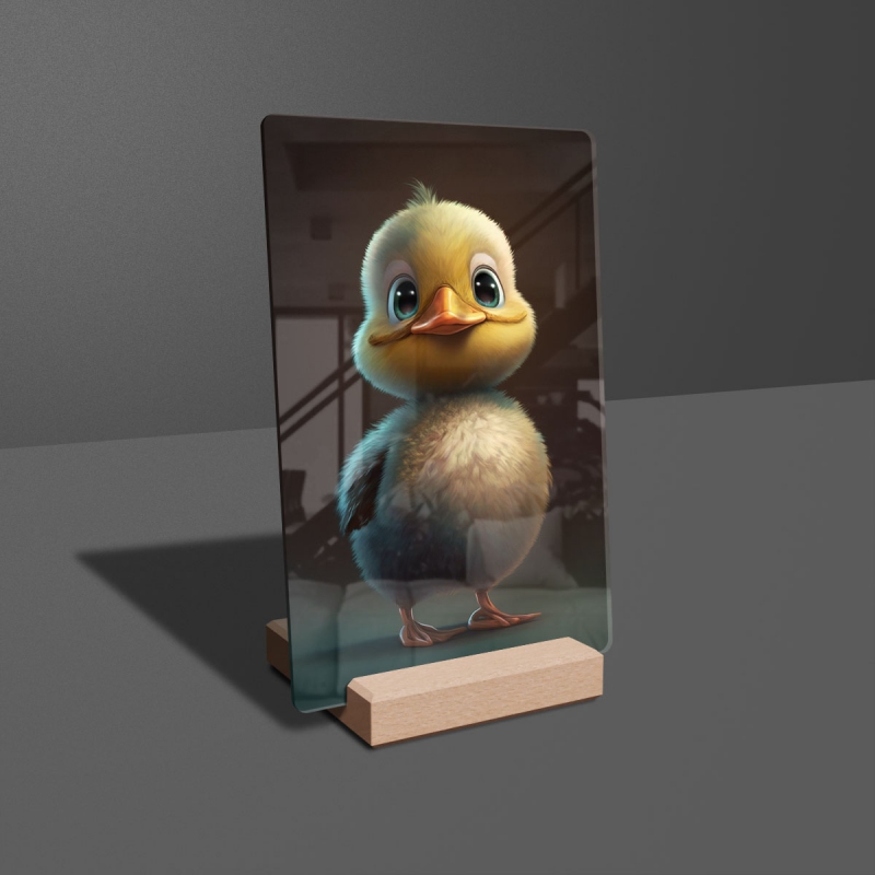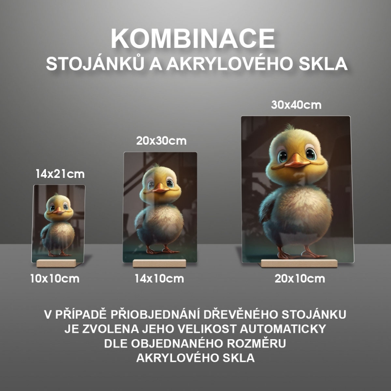 Na produktovém fotu vyobrazena nejoblíbenější varianta akrylového skla 14x21/21x14cm a dřevěný stojánek 10x10cm.