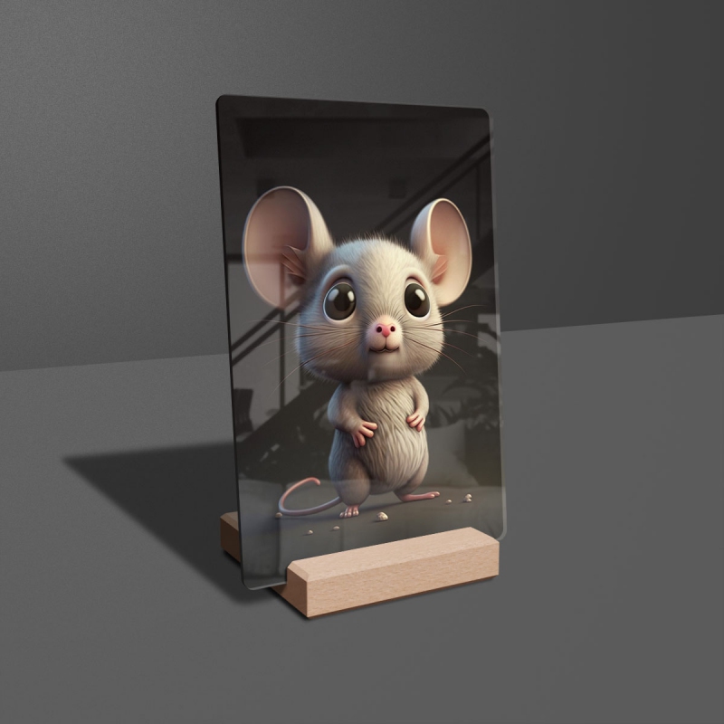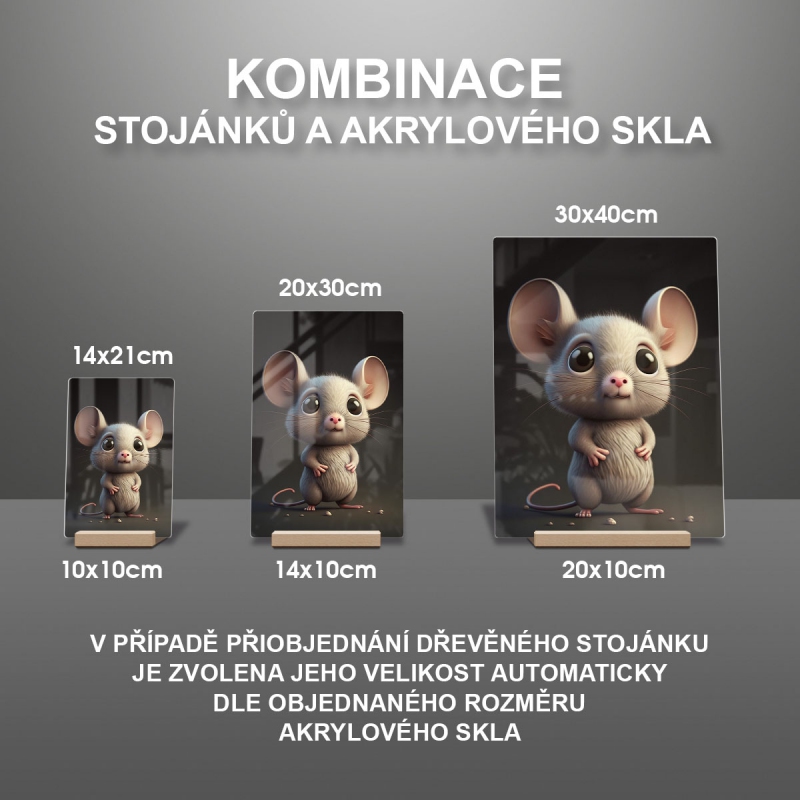 Na produktovém fotu vyobrazena nejoblíbenější varianta akrylového skla 14x21/21x14cm a dřevěný stojánek 10x10cm.