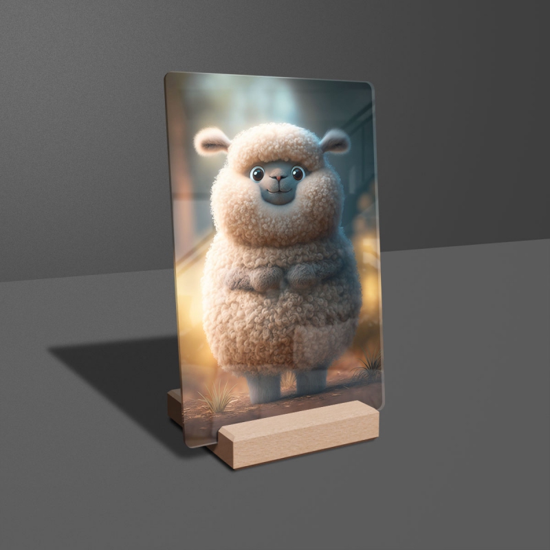 Na produktovém fotu vyobrazena nejoblíbenější varianta akrylového skla 14x21/21x14cm a dřevěný stojánek 10x10cm.