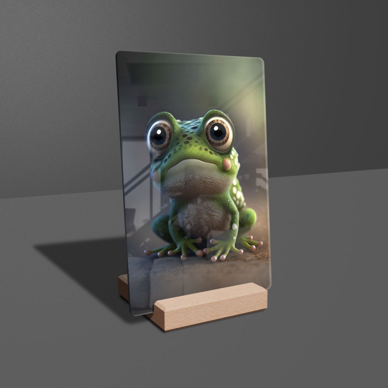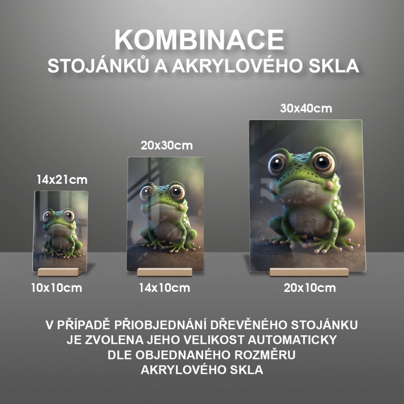 Na produktovém fotu vyobrazena nejoblíbenější varianta akrylového skla 14x21/21x14cm a dřevěný stojánek 10x10cm.