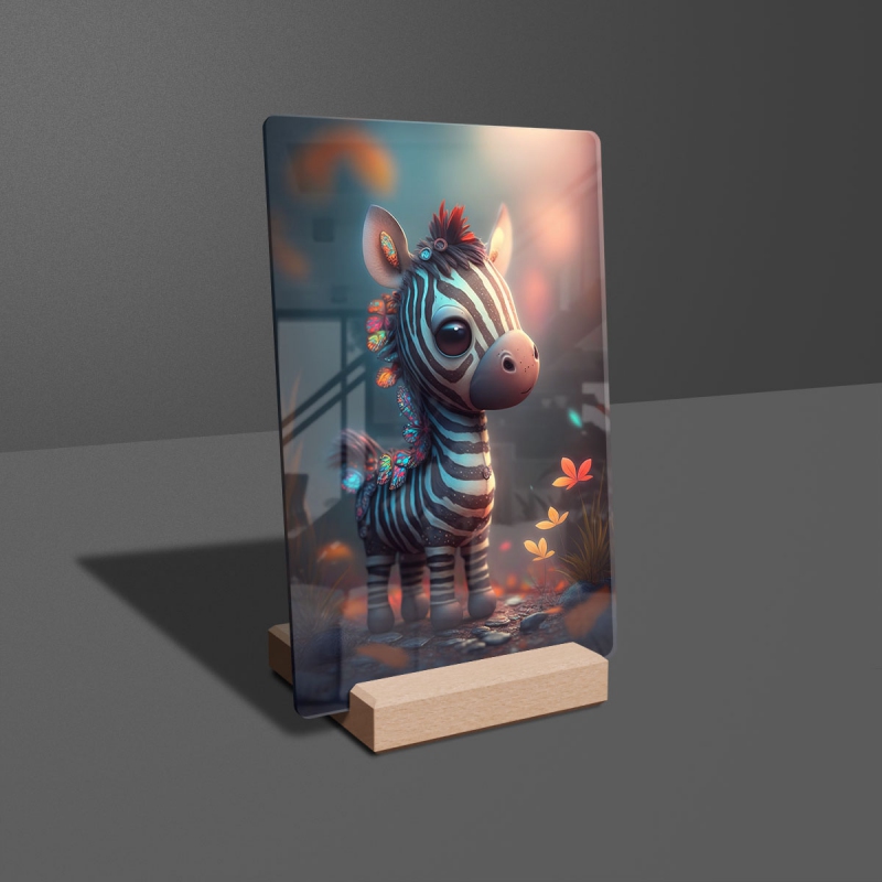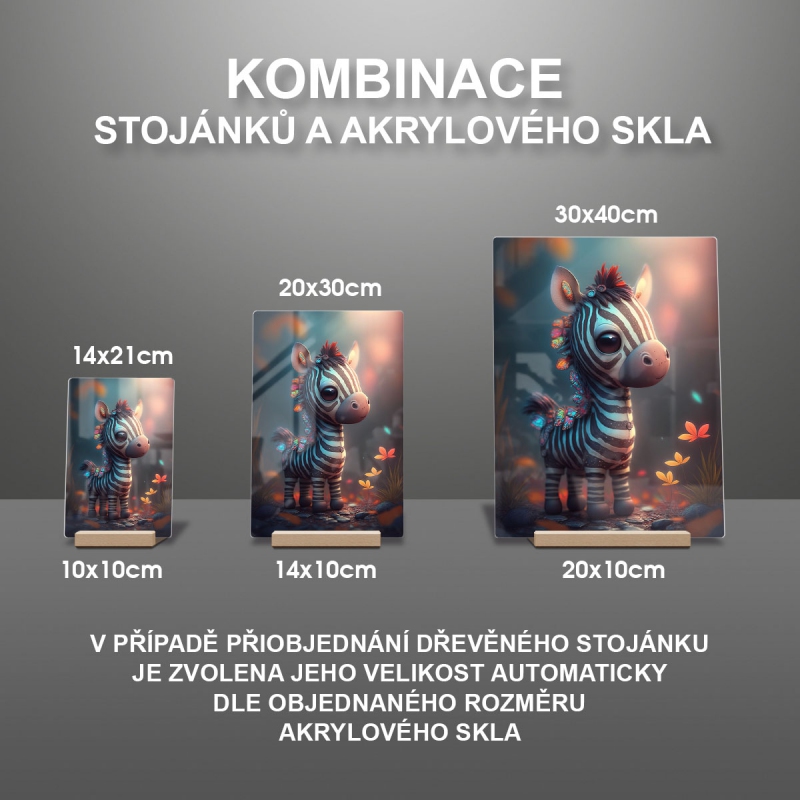 Na produktovém fotu vyobrazena nejoblíbenější varianta akrylového skla 14x21/21x14cm a dřevěný stojánek 10x10cm.