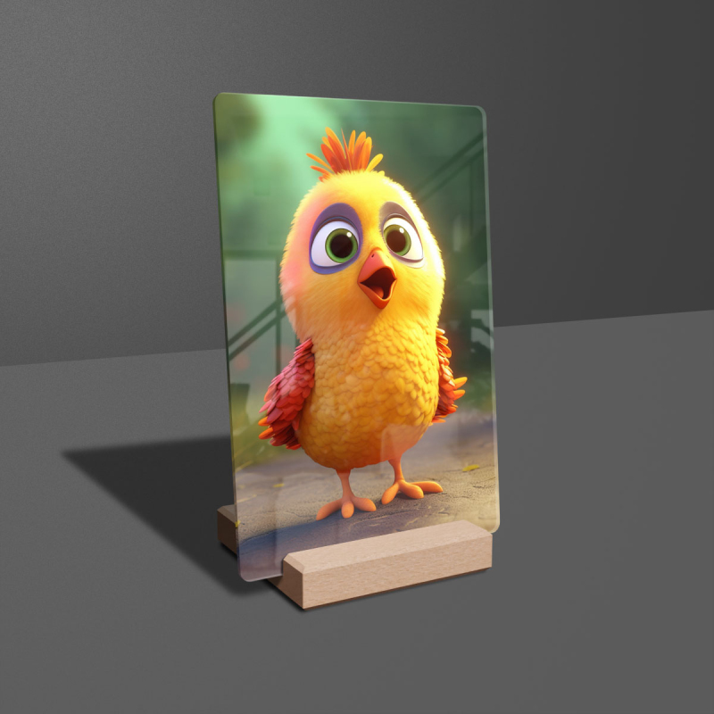 Na produktovém fotu vyobrazena nejoblíbenější varianta akrylového skla 14x21/21x14cm a dřevěný stojánek 10x10cm.