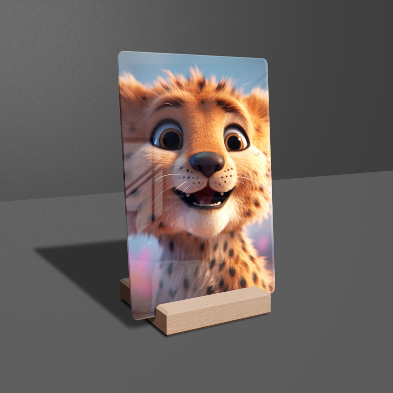 Na produktovém fotu vyobrazena nejoblíbenější varianta akrylového skla 14x21/21x14cm a dřevěný stojánek 10x10cm.