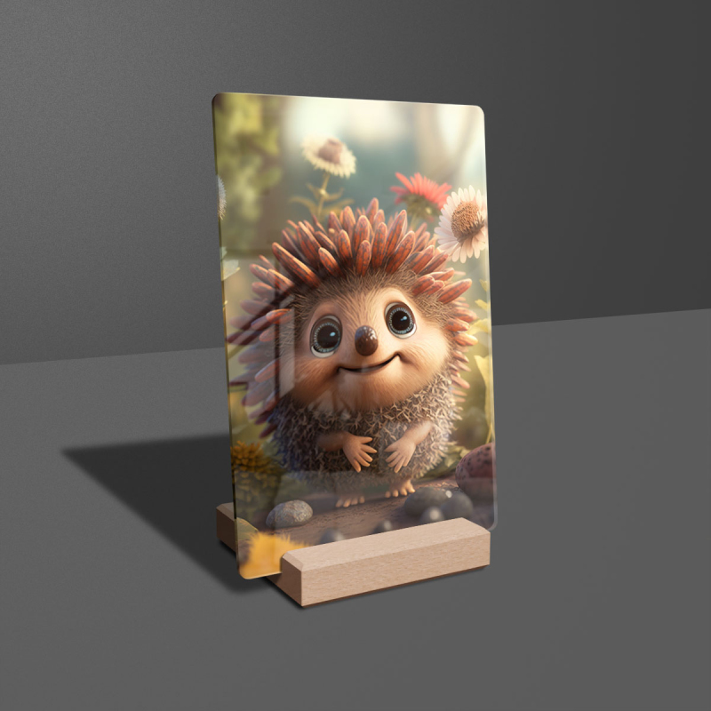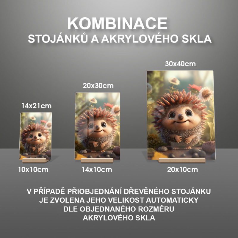 Na produktovém fotu vyobrazena nejoblíbenější varianta akrylového skla 14x21/21x14cm a dřevěný stojánek 10x10cm.