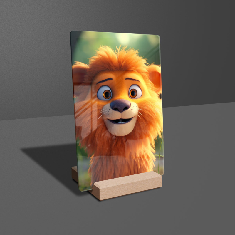 Na produktovém fotu vyobrazena nejoblíbenější varianta akrylového skla 14x21/21x14cm a dřevěný stojánek 10x10cm.