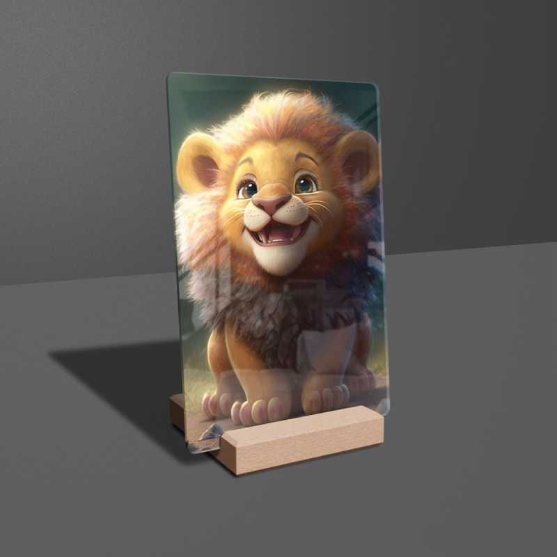 Na produktovém fotu vyobrazena nejoblíbenější varianta akrylového skla 14x21/21x14cm a dřevěný stojánek 10x10cm.