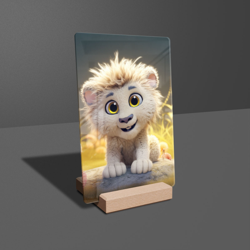 Na produktovém fotu vyobrazena nejoblíbenější varianta akrylového skla 14x21/21x14cm a dřevěný stojánek 10x10cm.